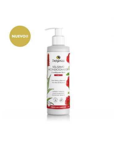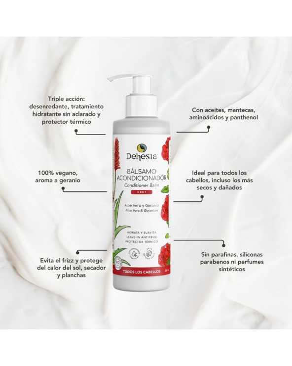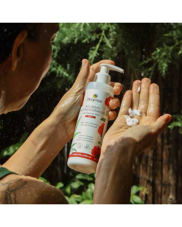 Bálsamo Acondicionador 3 en 1. Todo en un solo producto. Formulado con aloe vera, aceite de argán, aminoácidos, Pro-vitamina B5, ácido hialurónico vegetal y aceite esencial de geranio, este tratamiento capilar multifunción actúa como: