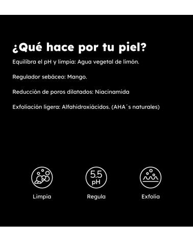 Tónico facial que regula y elimina las impurezas y la grasa generadas mientras dormimos, al igual que la polución que se adhiere a tu piel durante el día, para dejar tu piel limpia y fresca.