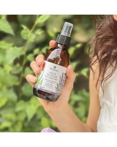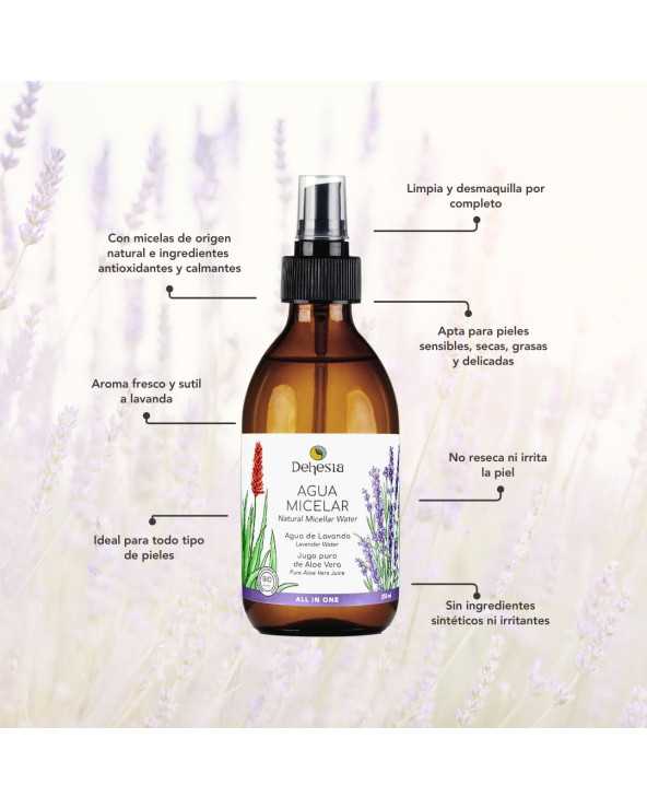 Agua micelar natural y suave ideal para limpiar y desmaquillar por completo el rostro de una pasada. No reseca ni deja la piel tirante. Ideal como primer paso de la limpieza facial. Formulada a base de micelas naturales que dejan la piel libre de partículas contaminantes y suciedad acumulada. Con jugo de aloe vera y agua de lavanda que aportan vitaminas y minerales ayudando a mantener la piel hidratada y suave. Además su fórmula está enriquecida con extractos de caléndula, limón, manzana y ginkgo biloba para ayudar a calmar y a descongestionar la piel. Respeta el equilibrio de la piel gracias a su pH fisiológico de 5,5 y es ideal para todo tipo de pieles incluso las más sensibles e irritadas.