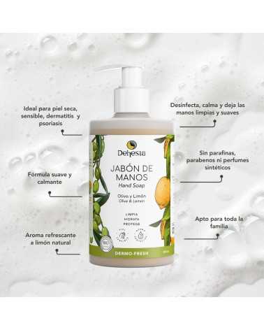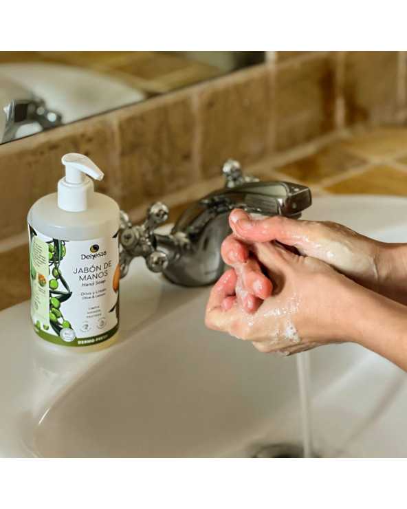 Jabón dermoprotector con aloe vera, extracto de oliva y un toque de limón, perfecto para cuidar tus manos en cada lavado.