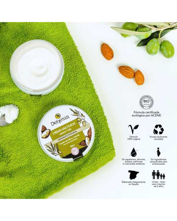 Crema natural multiusos ultra-hidratante suave y de rápida absorción rica en aceites y extractos vegetales con alta concentración en antioxidantes y vitaminas naturales que suavizan y reparan la piel de cualquier zona del cuerpo.