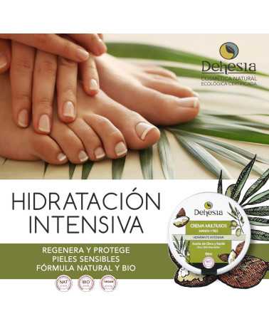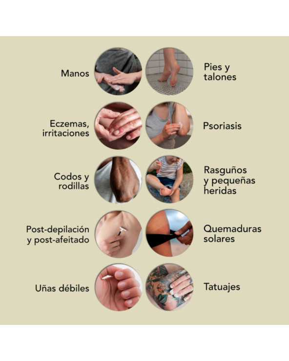 Ideal como crema de manos o pies así como para utilizarla como crema reparadora de talones y codos agrietados. Indicada para cualquier zona del cuerpo o cara que necesite un aporte extra de hidratación. Como complemento para la manicura y pedicura ya que gracias a su concentración en aceites vegetales ayuda a controlar hongos y bacterias y a fortalecer el crecimiento de las uñas. Para calmar el picor y la irritación en brotes de dermatitis y psoriasis. Indicada para evitar y reducir los eczemas.