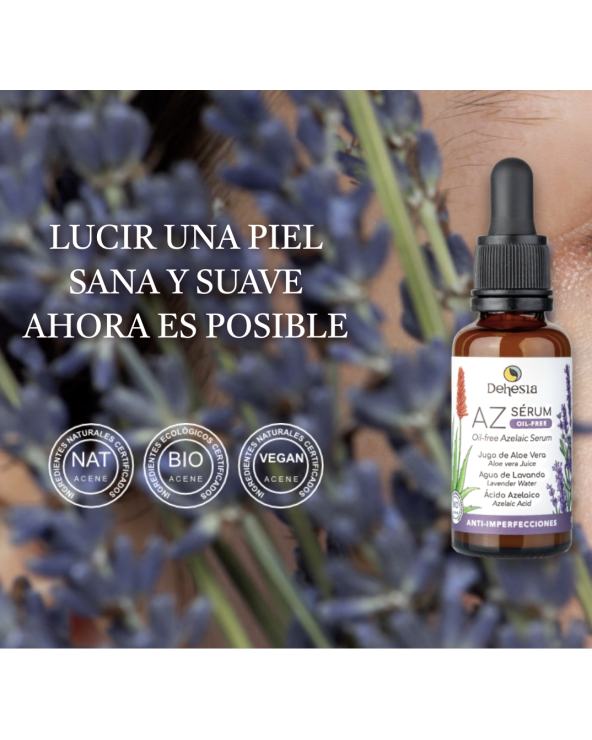 Adiós a las imperfecciones Este Sérum AZ se adapta a una amplia variedad de tipos de pieles al abordar problemas específicos como el exceso de grasa, la sequedad, la sensibilidad y las manchas. Si sientes que tu piel necesita sanarse... ¡dale la atención que se merece! Gracias a su formulación equilibrada y a la presencia de ingredientes antibacterianos y purificadores como el ácido azelaico, descubrirás que es posible lucir una piel sedosa, luminosa y sin imperfecciones. Además el ácido azelaico tiene poder antibacteriano y es capaz de inhibir la enzima tirosinasa, que provoca la hiperpigmentación mejorando y evitando las manchas cutáneas. La solución oil-free que estabas esperando.