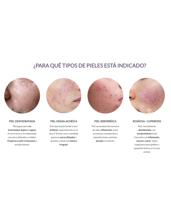 - Mejora la jugosidad y suavidad en pieles deshidratadas y/o con rosácea.